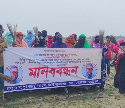 মোরেলগঞ্জে জমি ও মৎস্য ঘের দখলের অভিযোগে মানববন্ধন ও ঝাড়ু মিছিল